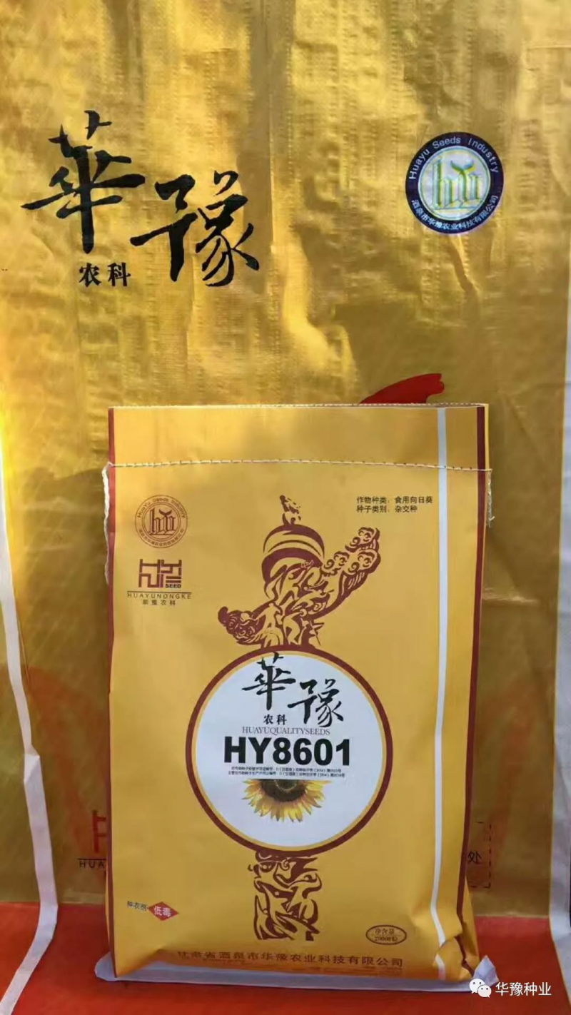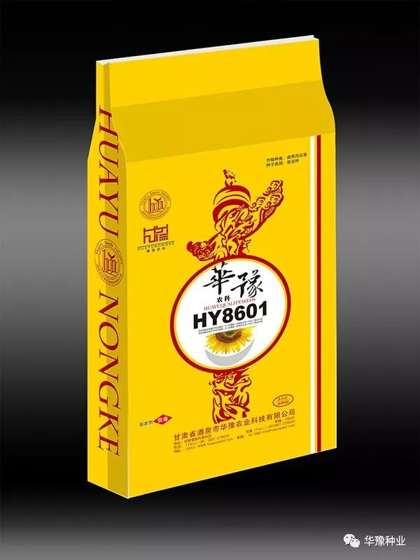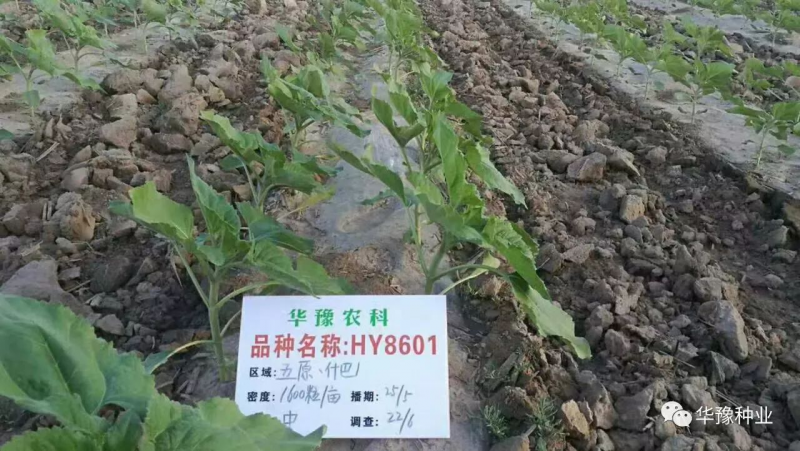 HY8601品种主要性状:该产品系早熟长粒型食用向日葵葵杂交种,生育期105天,株高160-180厘米;籽粒长圆锥形,颜色黑白条纹。出苗快,易保苗;抗旱,耐贫瘠。籽粒商品性好,结实率高,增产潜力大。该品种田间自然发病鉴定结果,对黑斑、褐斑和黄萎病有较好的抗性。