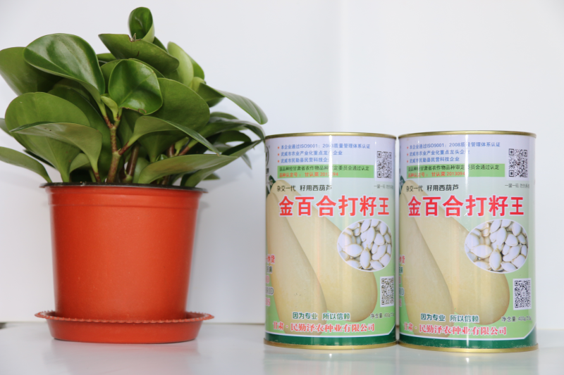“金百合打籽王”是从国外优选材料中筛选出的籽用型西葫芦杂交一代新品种,植株生长旺盛,中熟、直立短蔓生长,瓜形长条形,平均单株座老熟瓜2-3个,单瓜种子数430粒左右,籽粒千粒重185g,籽大,色泽光亮,籽仁绿色,适宜炒货、扒仁等多种用途,平均亩产160-180kg,高产种植者可达240kg以上。