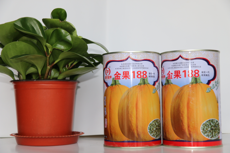 “ 金果188”是甘肃.民勤泽农种业有限公司西葫芦研究中心依据现代生物遗传理论,在金果系列无壳南瓜基础上进行培育的创新三元杂交南瓜种,生育期105天左右,蔓长60CM,座瓜节位极底3-4节,结瓜整齐一条线,瓜型一致,叶片圆型,叶色深绿,果实高圆形,皮硬,中型果实,种子籽小,千粒重120g左右,400g籽粒数可达3300粒左右,商品千粒重150g左右,抗病性状突出,商品籽仁墨绿,色泽美观,商品性状好,在栽培技术,水肥条件好时,可达到200kg以上,具有产量稳定,适应性广等特点。