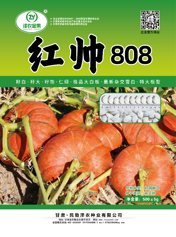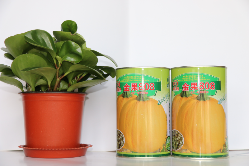 金果808是甘肃.民勤泽农种业有限公司西葫芦研究中心依据现代生物遗传理论,在金果系列无壳南瓜基础上进行培育的创新三元杂交南瓜种,生育期105天左右,蔓长60CM,座瓜节位极底3-4节,结瓜整齐一条线,瓜型一致,叶片圆型,叶色深绿,果实高圆形,皮硬纯黄瓜,中型果实,种子籽小,千粒重120g左右,800g籽粒数可达6600粒左右,商品千粒重150g左右,抗病性状突出,商品籽仁墨绿,色泽美观,商品性状好,在栽培技术,水肥条件好时,可达到200kg以上,具有产量稳定,适应性广等特点。