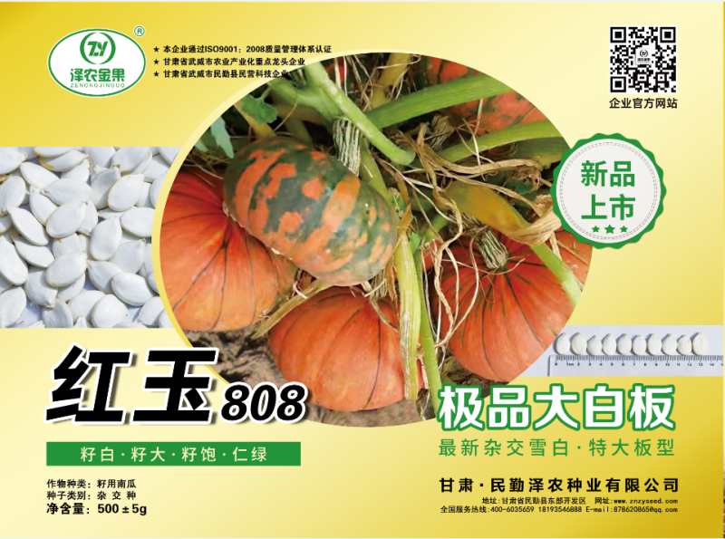 该品种是甘肃民勤泽农种业有限公司依据现代生物遗传理论,在原“泽农金果”无种壳南瓜的基础上培育的创新三元无壳杂交南瓜种。该品种瓜呈高圆型,抗病抗逆性强,短蔓,蔓长约60cm左右,极易座瓜,结瓜整齐一致,结位3-4节,老熟瓜黄色,单果籽数600多粒,籽粒饱满,籽深绿色,色泽美观,商品性特高,一般亩产180公斤左右,在栽培精良,水肥条件优越时可达到240公斤左右。具有高产稳产、适应性广等特点。