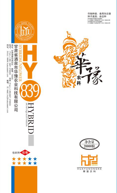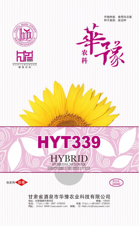 华豫HYT339品种主要性状: 中熟食用向日葵杂交种,生育期95至105天;茎杆粗壮,叶片肥大,色淡绿,平均叶片数26-31片;植株高约175-195厘米;花盘整齐,背部凸起;盘径25-30厘米;长粒型。黑底白边。粒长2.2厘米,籽粒宽0.9厘米,大籽仁型,饱满度好,植株整齐、抗叶霉毒、霜毒病、斑枯病。土壤肥沃的土地亩产260公斤。
