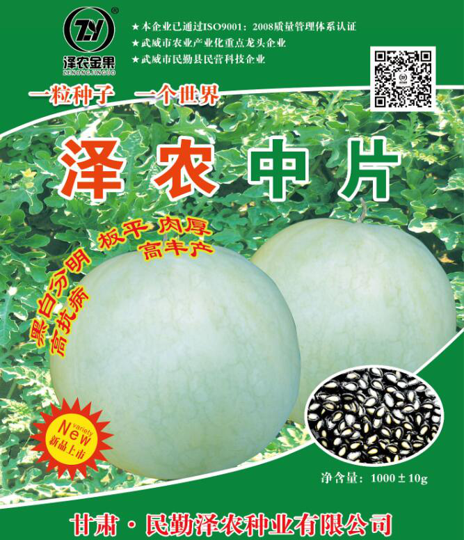 “泽农中片”系甘肃民勤泽农种业有限公司培育的黑瓜籽优良新品种,综合抗病性状突出,板平肉厚,黑白分明,老熟瓜色泽乳白,生育期105天左右,果实圆形,植株生长强势,易座瓜,单瓜重1.5-2.5kg,瓜蔓120cm左右。易管理、高产稳产。 栽培技术: