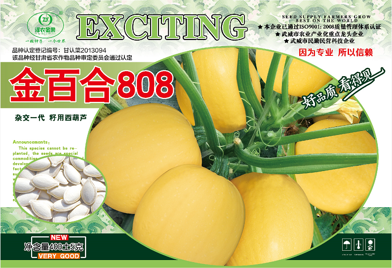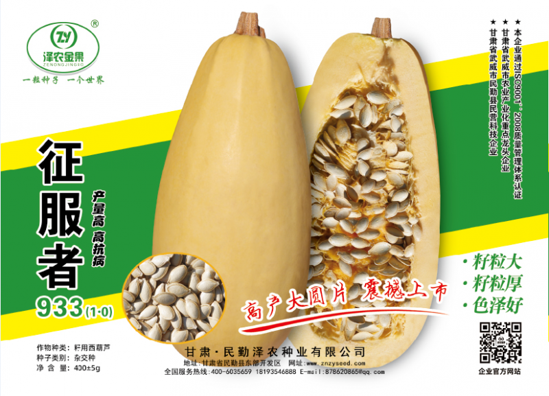 征服者933(1·0)是甘肃・民勤泽农种业公司利用国外优势材料精心选育的新一代籽用西葫芦新品种,生育120天左右,植株短,蔓直立生长,结果性极好,幼瓜嫩绿色,老熟瓜呈淡黄色,瓜型粗短筒形,节瓜1-3个,间接短,籽粒雪白,片形大而一致,10粒横排可达10cm,瓜籽肥厚,厚度达3.5mm,生长强强,高抗白粉,属中晚熟植品种,株距35cm-40cm,亩保苗2300株左右,一般高产180公斤左右,水肥条件好和管理到位可达240公斤左右,是目前西葫芦炒货最理想的高产、高品质换代产品。