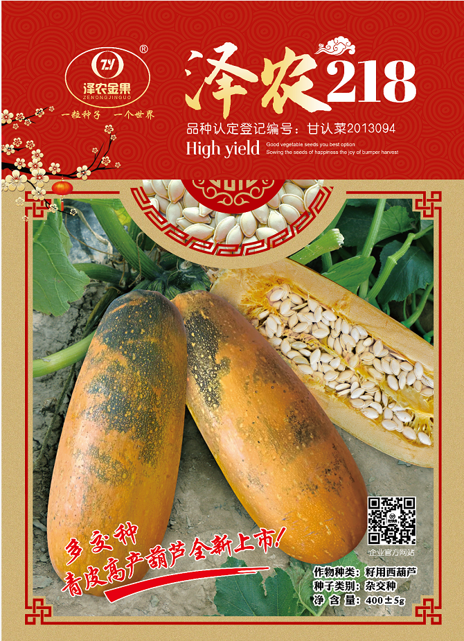 “泽农218”是由我公司最新培育的西葫芦多交种,生期105天,直立短蔓生长,座瓜集中,生长势强,综合抗病性状突出,抗旱,耐涝,不死苗,高耐白粉病,瓜为圆筒形,果色为绿色,单株座瓜2-4个,平均座瓜2个以上,单瓜结籽数450粒左右,千籽重180-200g。高水肥科学种田亩产可达520斤以上,大片占比36%以上。花后一个月摘除植株生长点,产量更高,饱满度更好,(注:亩保苗不得超过2500株,甘肃地区人工种植可采用“两行半”的种植模式)