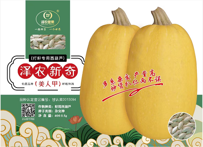 该品种是从国外优选材料中最新培育的高产换代改良升级版美人甲类型籽用西胡芦新品种,生育期100一110天,生长势强。短蔓直立生长,瓜形呈两头齐短粗型,综合抗病性好.高抗白粉病、叶斑病,枯蒌病、瓜皮厚、不易坏瓜。平均单株坐老熟瓜3个或以上,单瓜籽粒350一550粒左右,籽粒宽而长,色泽光亮雪白,籽粒饱满,适宜食用、加工等多种用途。露地种植平均亩产量200公斤左右,水肥条件得当的情况下高产可达260公斤以上,是目前籽用西葫芦市场理想的升级换代产品。