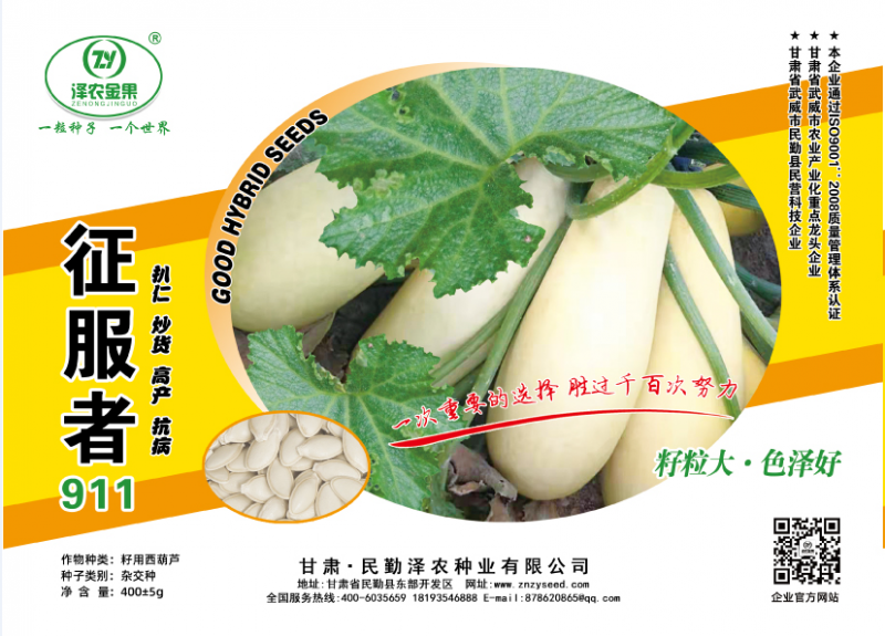 征服者911是我公司利用国外资源和国内优选材料精心培育的丰产短蔓,籽用型杂交一代新品种,生育期120天左右,属中晚熟品种,生长强势,出苗整齐一致,节间短,不拉蔓,单株可结老熟瓜1-3个,幼瓜嫩绿色、长圆筒形,老熟瓜淡黄色,瓜皮坚硬不易软腐,籽腔大,瓜籽千粒重170克左右,增产潜力大,商品均匀一致,一般高产180公斤左右,水肥和管理条件优越亩产可达240公斤左右,是目前籽用西葫芦炒货最理想的换代产品。(本品属稀植品种,保苗2300左右,株距35cm)