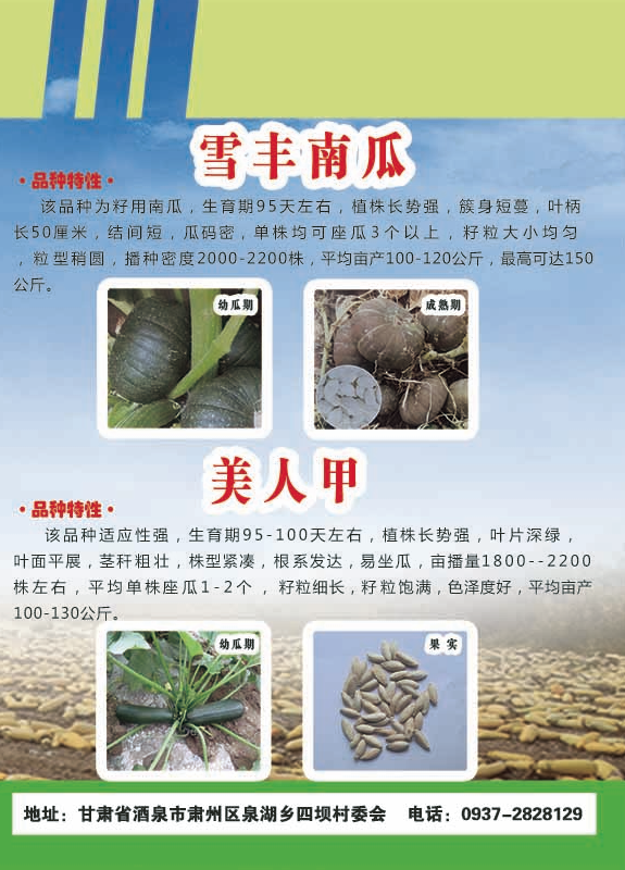 该品种为籽用南瓜,生育期95天左右,植株长势强,族身短蔓,叶柄长50厘米,结间短,瓜码密,单株均可座瓜3个以上,籽粒大小均匀,粒型稍圆,播种密度2000-2200株,平均亩产100-120公斤,最高可达150公斤。